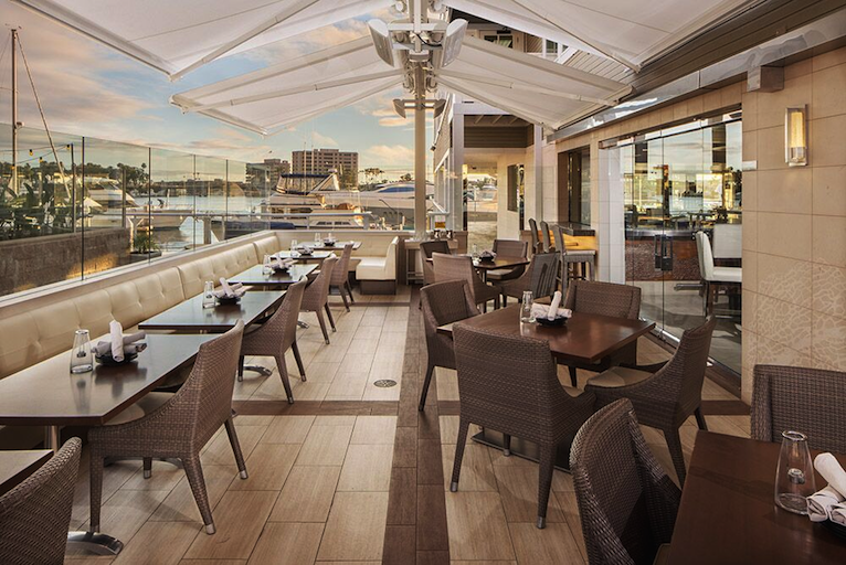 Rick McCormack, founder of Studio McCormack, also sought to blur the lines between the indoors and out with floor-to-ceiling glass windows wrapping around the entire space, providing guests with unobstructed views that span from inside the restaurant out to the bay. For al fresco dining, the new eatery offers a cozy 40-seat patio, which features a unique, retractable overhead awning, wicker chairs, and a view of the marina.