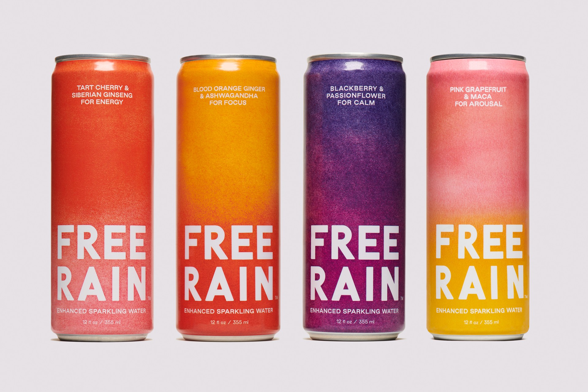 FREE RAIN is the naturally-enhanced sparkling water for those seeking more — more flavor, more function, and more feeling. With four bold flavors, each can contains benefit-driven ingredients designed to elevate or relax the mind and body throughout the day. Key ingredients include eleuthero for more energy, ashwagandha for more focus, passionflower for more calm and now maca for more arousal.
